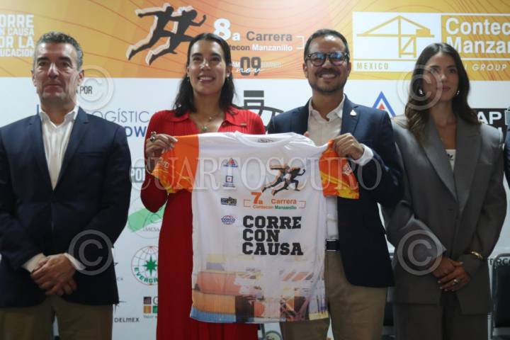 CIUDAD DE MÉXICO, 06SEPTIEMBRE2025.- José Antonio Contreras, director General de Contecon de Manzanillo; Josefina Rodríguez, secretaria de Turismo; Jorge Padilla, subsecretario de Turismo en Colima, representante de la gobernadora del estado de Colima, y Ana Laura González, atleta de alto rendimiento (madrina de la carrera), encabezaron la presentación de la Octava Carrera Contecon Manzanillo, que tendrá su encuentro el 9 de noviembre en este estado. El acto se realizó en la Secretaria de Turismo. FOTO: GRACIELA LÓPEZ/CUARTOSCURO.COM