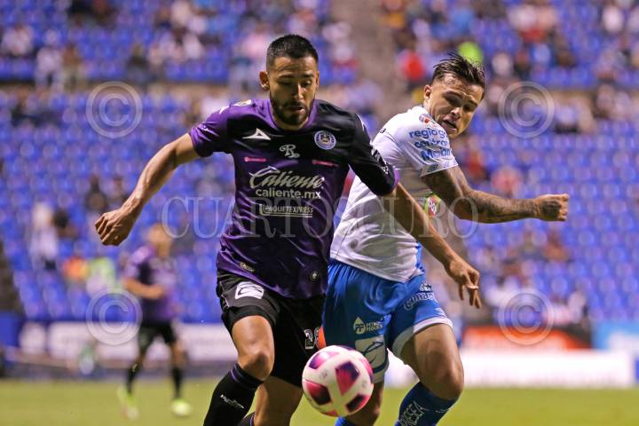 Jorge Padilla y Cristian Tabó durante el partido entre Club Puebla y Mazatlan F.C. del torneo Grita México Apertura 2021 de la Liga BBVA MX, celebrado en el estadio Cuauhtémoc.