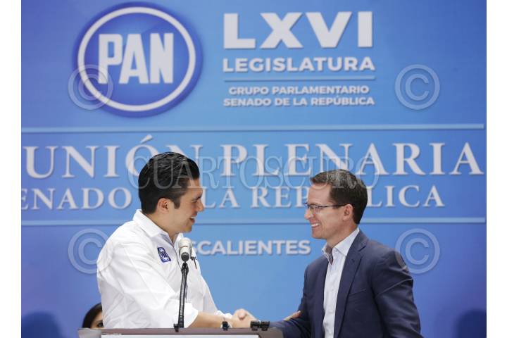 AGUASCALIENTES, AGUASCALIENTES, 30ENERO2025.- El senador Ricardo Anaya fue elegido como el coordinador de los parlamentarios blanquiazules durante su reunión plenaria. En la imagen el ex candidato presidencial saluda a Jorge Romero, dirigente nacional de su partido. FOTO: CUARTOSCURO.COM