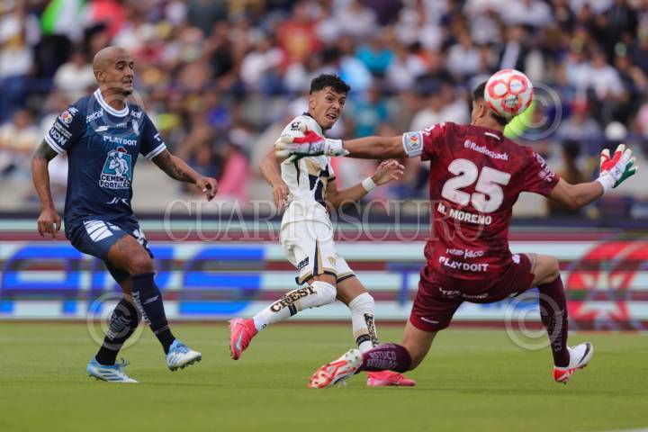 CIUDAD DE MÉXICO, 20JULIO2025. Jorge Ruvalcaba de los Universitarios tira a gol tras la salida del portero de los Tuzos, Carlos Moreno durante el partido de fútbol Pumas vs Pachuca correspondiente a la jornada 2 del Torneo Apertura 2025 de Liga BBVA MX, en el Estadio Olímpico Universitario. FOTO: EDGAR NEGRETE LIRA/CUARTOSCURO.COM
