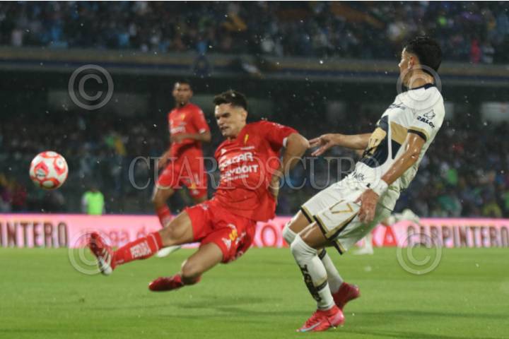 CIUDAD DE MÉXICO, 10AGOSTO2025.- Tomas Jacob, mediocentro de Necaxa, y Jorge Ruvalcaba, mediocampista de Pumas, disputaron el balón durante la Jornada 4 de la Liga MX en el Estadio Olímpico Universitario. FOTO: GRACIELA LÓPEZ/CUARTOSCURO.COM