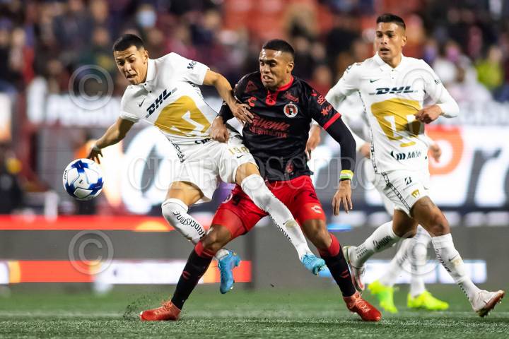 Jorge Ruvalcaba (Pumas) disputa un balón con Mauro Manotas (Tijuana) en el partido disputado la noche de ayer en el Estadio Caliente.
