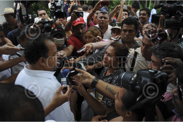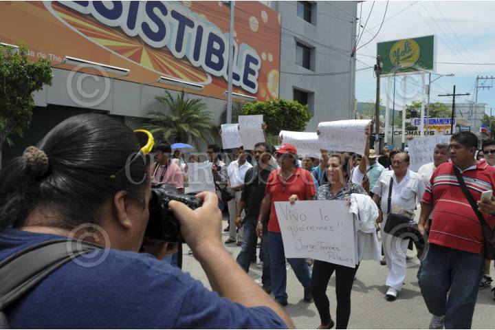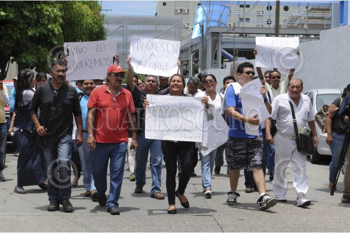 ACAPULCO, GUERRERO, 30MAYO2014.- Periodistas y familiares del comunicador Jorge Torres Palacios, quien presuntamente fue secuestrado ayer en la Unidad Habitacional El Coloso, el comunicador se desempeñaba como vocero de la Secretaría de Salud del Puerto, marcharon para pedir que las autoridades tomen cartas en el asunto, el contingente se dirigió hacia las instalaciones de la PGEJ, a la cual esta prohibido el acceso para los periodistas motivo por lo que fueron atendidos en la puerta. La PGJE anunció que la investigación es llevada a través de la Fiscalía Regional de Acapulco, proseguirá con las investigaciones a efecto de lograr ubicar y rescatar al funcionario que fue privado de su libertad. Los informadores también abordaron a Luis Walton, presidente municipal de Acapulco, para pedirle su intervención. En la imagen la esposa del Torre Palacios, Maribel Helguera Jiménez, llora desesperada. FOTO: BERNANDINO HERNÁNDEZ /CUARTOSCURO.COM