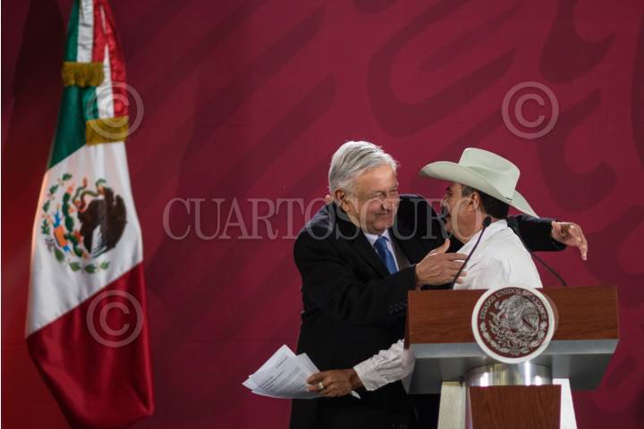 CIUDAD DE MÉXICO, 11ENERO2019.- Andrés Manuel López Obrador, presidente de México; abraza efusivamente a Jorge Zapata, nieto del héroe revolucionario, Emiliano Zapata, durante la conferencia matutina a medios de comunicación. FOTO: MISAEL VALTIERRA / CUARTOSCURO.COM