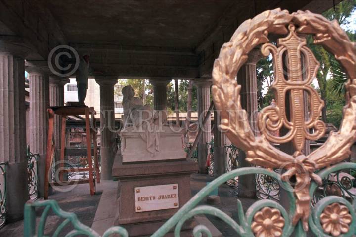 Después de años de abandono, la tumba de uno de los ex presidentes más ilustres de México está siendo restaurada por la empresa McCartney Internacional, con autorización del INAH y de la delegación Cuauhtémoc. El proyecto cuesta aproximadamente 400 mil pesos; pero, hasta el momento, sólo se han recaudado alrededor de 100 mil pesos, con aporte de la iniciativa privada y de la comunidad oaxaqueña. FOTO: Oswaldo Ramírez/CUARTOSCURO.COM