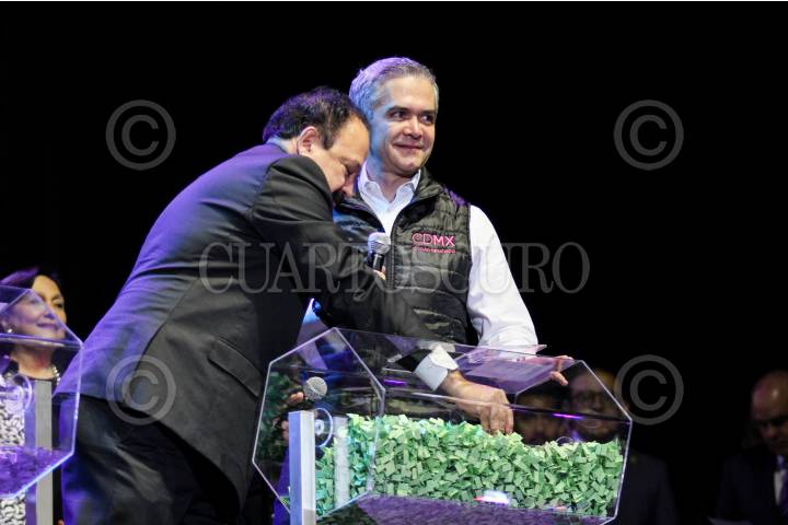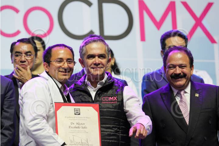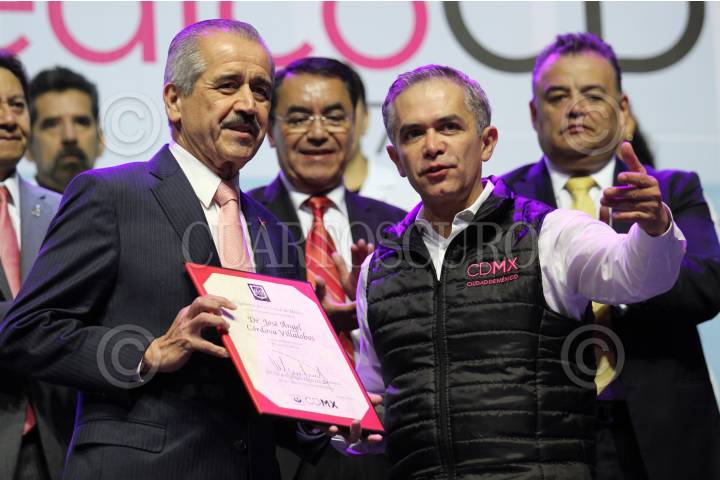 CIUDAD DE MÉXICO, 23OCTUBRE2017.- José Ángel Córdova Villalobos, y Miguel Ángel Mancera, jefe de gobierno de la Ciudad de México, durante la celebración por el Día del Médico, fecha que conmemora la inauguración por parte de Valentín Gómez Farías del Establecimiento de Ciencias Médicas en la Ciudad de México. En la imagen, Mancera Espinosa hace entrega del Premio al Mérito Médico Ciudad de México. FOTO: GALO CAÑAS /CUARTOSCURO.COM