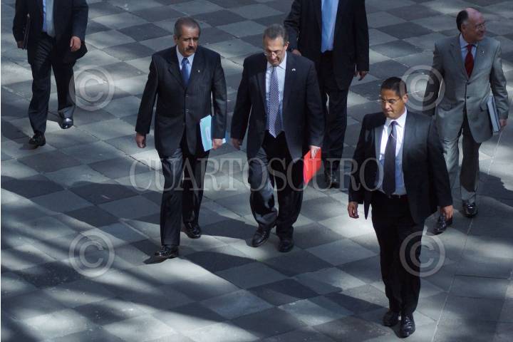 MÉXICO, D.F., 20NOVIEMBRE2012.- Raúl Plascencia Villanueva, presidente de la Comisión Nacional de Derechos Humanos, Dionisio Pérez-Jácome, secretario de Comunicaciones y Transportes, Genaro García Luna, secretario de Seguridad Pública federal, José Ángel Córdova Villalobos, secretario de Educación Pública, José Antonio Meade Kuribreña, secretario de Hacienda y Crédito Público, y Rosalinda Velez Juárez, secretario del Trabajo, en la explanada del monumento a Francisco I. Madero, en los Pinos, en donde se realizó la ceremonia conmemorativa del CII Aniversario del Inicio de la Revolución Mexicana. FOTO: MOISÉS PABLO /CUARTOSCURO.COM