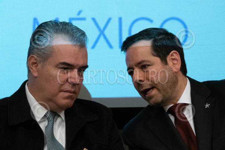 CIUDAD DE MÉXICO, 04DICIEMBRE2023- El moderador Manuel Oropeza Cárdenas; Franciso Cervantes Díaz, presidente del Consejo Coordinador Empresarial; José Antonio Abugaber Andonie, presidente de la Cocamin, y José Zozaya Delano, Asociación Mexicana de la Industria Automotriz, durante la presentación de la nueva era de la política industrial digital en México, realizada en el Club de Industriales. FOTO: GRACIELA LÓPEZ /CUARTOSCURO.COM