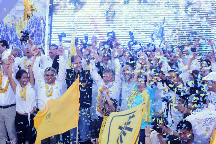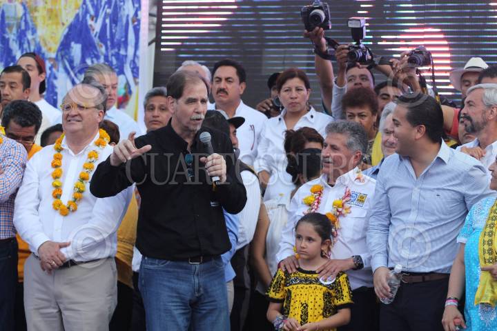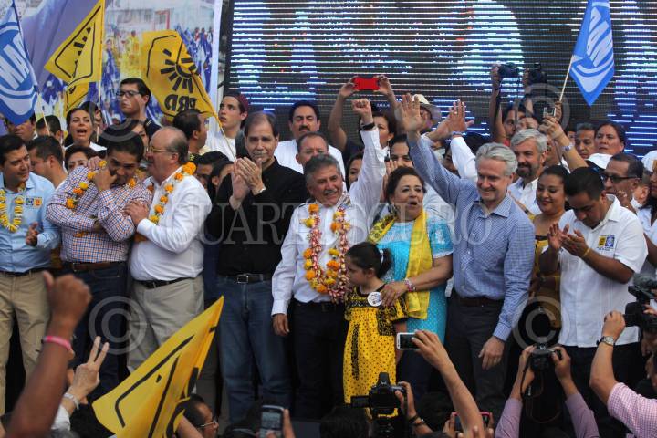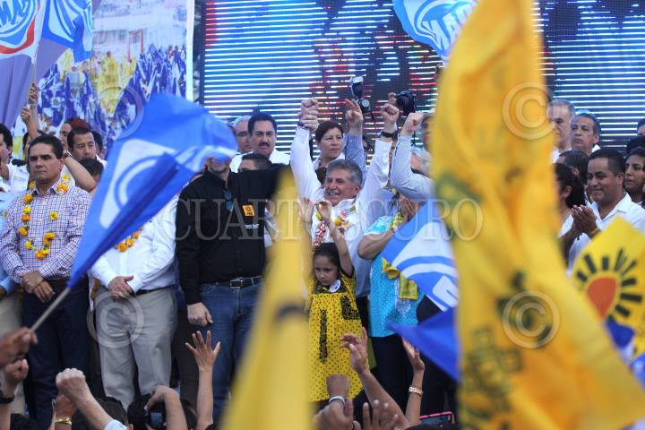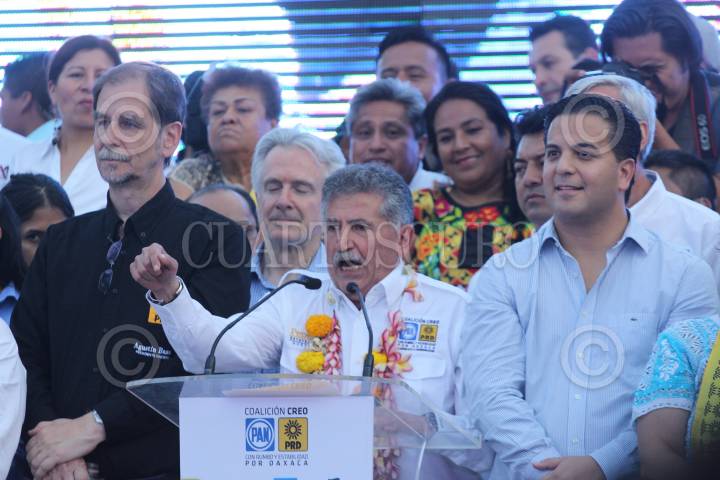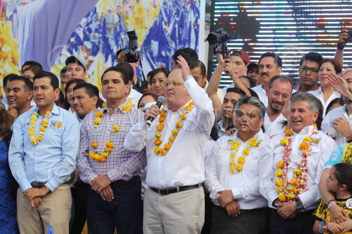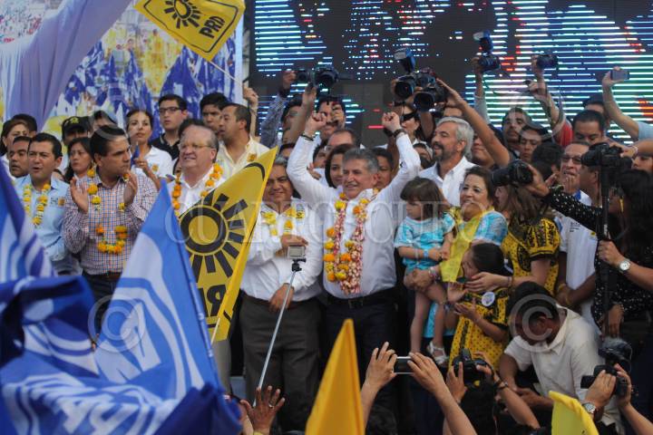 OAXACA, OAXACA., 29MAYO2016.- José Antonio Estefan Garfias, candidato a la gubernatura por la coalición que conforman el PAN y PRD cerró su campaña este domingo en la cuidad de Oaxaca con un mitin en el que estuvo acompañado del presidente nacional del PRD, Agustín Basave, del secretario General del PAN, Damián Zepeda, así como los gobernadores de Morelos y Michoacán, Graco Ramírez y Silvano Aureoles. FOTO: ARTURO PÉREZ ALFONSO /CUARTOSCURO.COM