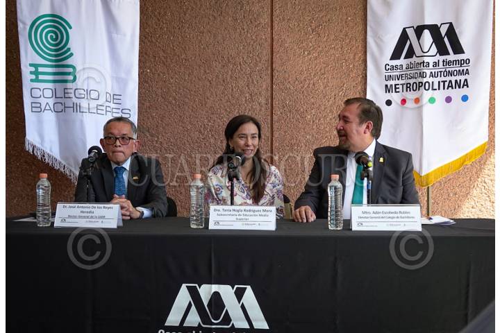 CIUDAD DE MÉXICO, 25FEBRERO2025.- Jose Antonio de los Reyes, rector de la UAM, Tania Rodríguez, subsecretaría de educación, Adán Escobedo, director general del Colegio de Bachilleres encabezaron la firma del Convenio General de Colaboración entre el Colegio de Bachilleres y la Universidad Autónoma Metropolitana, en la que D considerará el desarrollo de las bases y condiciones para la implementación de un posible Mecanismo de Admisión por Reconocimiento de Trayectoria Escolar Preuniversitaria. FOTO:ROGELIO MORALES/CUARTOSCURO.COM