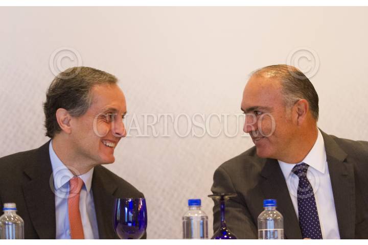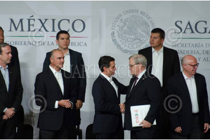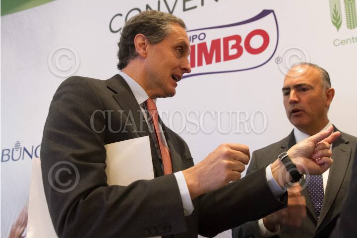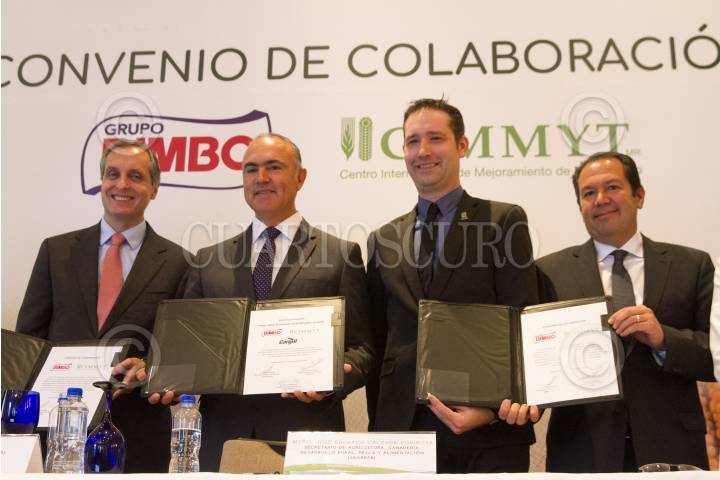 CIUDAD DE MÉXICO, 13NOVIEMBRE2017.- Daniel Servijte, presidente de Grupo Bimbo, y José Calzada Rovira, titular de la Sagarpa, durante una firma de colaboración entre Bimbo y el Centro Internacional de Mejoramiento de Maíz y Trigo (CIMMYT). FOTO: MOISÉS PABLO /CUARTOSCURO.COM