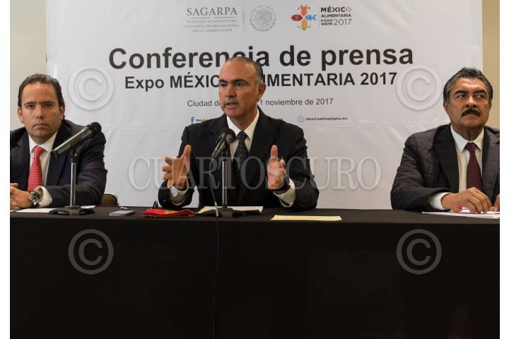 CIUDAD DE MÉXICO, 21NOVIEMBRE2017.- José Calzada Rovirosa, Secretario de Agricultura, Desarrollo Rural, pesca y alimentación, Alejandro Vázquez Salido, director en jefe de la Agencia de Servicios a la Comercialización y desarrollo de Mercados Agropecuarios (ASERCA), Ramiro Hernández, coordinador general de delegaciones de la Secretaría de Agricultura, Ganadería, Desarrollo Rural (SAGARPA), encabezaron el anuncio de la segunda edición de la Feria Agroalimentaria, que se llevara a cabo del 7 al 9 de diciembre en el Centro Citibanamex en la Ciudad de México. FOTO: ANDREA MURCIA /CUARTOSCURO.COM
