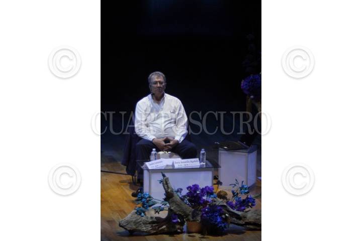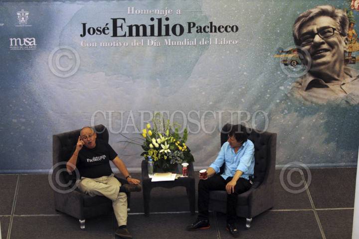 GUADALAJARA, JALISCO, 29ABRIL2014.- Esta noche en las instalaciones del Museo de las Artes (MUSA) de la Universidad de Guadalajara y en el marco de las actividades de la lectura en voz alta por el Día Mundial del Libro que organiza la Feria Internacional del Libro en Guadalajara, se llevo a cabo el dialogo publico denominado “La Ciudad y la Memoria” en torno a la figura y obra del escritor José Emilio Pacheco, entre los escritores Benito Taibo (México) y Xavier Velasco (España). FOTO: FERNANDO CARRANZA GARCIA /CUARTOSCURO.COM