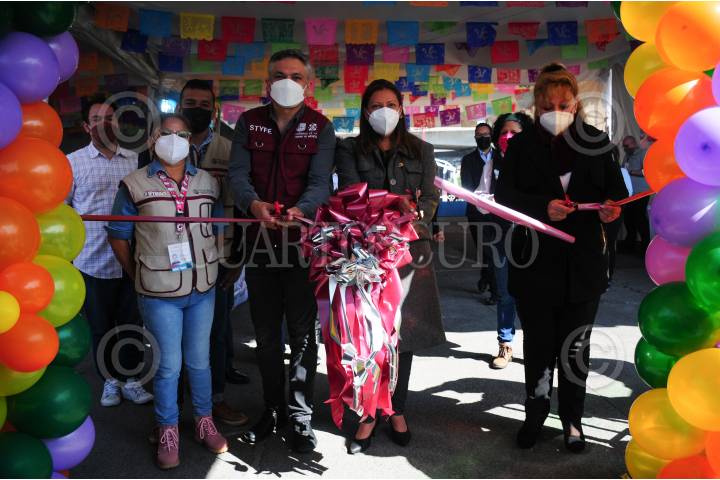 José Luis Rodriguez Díaz de León, secretario de trabajo de la capital y Evelyn Parra, alcaldesa de Venustiano Carranza, cortan el listón que inaugura la Feria del Empleo.