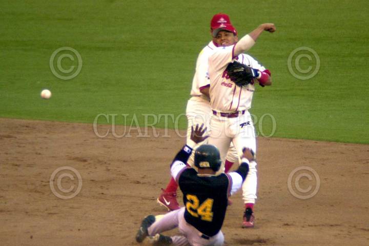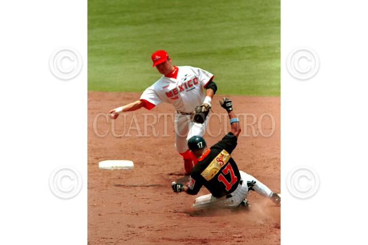 Luis Polonia bateador designado por los Tigres Capitalinos hece robo de base mientras José Luis el Borrego Sandoval lanza a primera para marcar una doble matanza. En el segundo juego de la serie entre los Diablos de México y los Tigres Capitalinos. FOTO: David Bolaños/CUARTOSCURO.COM