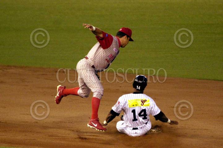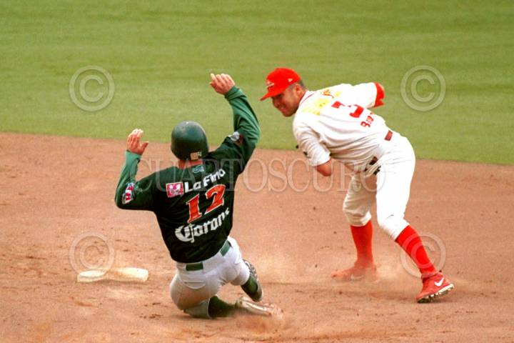 Ricardo Soriano de los Cafeteros de Puebla se barre en segunda base ante la inminente doble matanza que José Luis Sandoval de los Diablos de México propiciaria, durante el segundo juego de la serie. FOTO: David Bolaños/CUARTOSCURO.COM