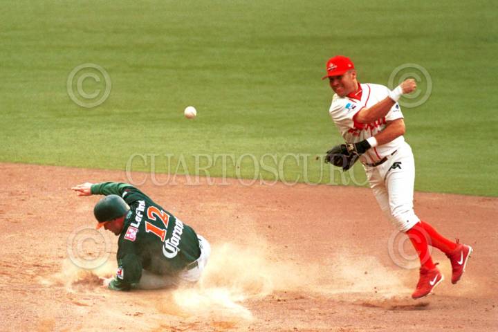 Howie Clark jardinero Central de los Leones de Yucatán, se barre a segunda base , mientras José Luis Sandoval parador en corto de los Diablos de México lanza a primera base para lograr una doble matanza. FOTO: David Bolaños/CUARTOSCURO.COM