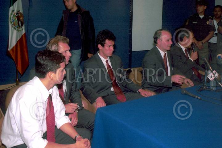 Pinheiro, Héctor Adomaitis, Alváres Cueva y José Luis Trejo durante la conferencia de prensa que ofreció el Cruz Azul a su llegada al aeropuerto de la Cd de México. FOTO: David Bolaños/CUARTOSCURO.COM