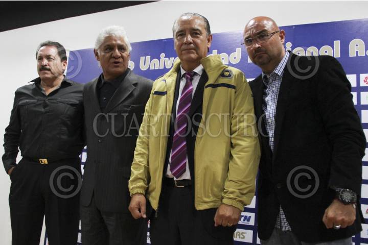 MÉXICO, D.F., 04SEPTIEMBRE2013.- Gustavo Vargas, Auxiliar Técnico, Mario Trejo, Vicepresidente Deportivo del Club Universidad, José Luis Trejo, nuevo Director Técnico del Club Universidad y Dudley Hitchman Preparador Físico, durante la presentación del nuevo técnico por lo que resta de la temporada y de la siguiente. FOTO: ADOLFO VLADIMIR /CUARTOSCURO.COM
