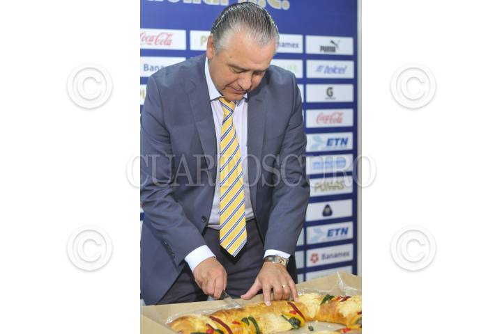 MÉXICO, D.F., 03ENERO2014.- José Luis Trejo, entrenador de Pumas de la Universidad Nacional Autónoma de México (UNAM), ofreció una conferencia de prensa a los medios de comunicación manifestando su tranquilidad ante el inicio del Torneo Clausura 2014, aclaró que su objetivo principal es entrar a la próxima liguilla, sin preocuparse por el descenso. Después de la conferencia de prensa partió la tradicional Rosca de Reyes donde se saco un muñeco. FOTO: DIEGO SIMÓN SÁNCHEZ /CUARTOSCURO.COM