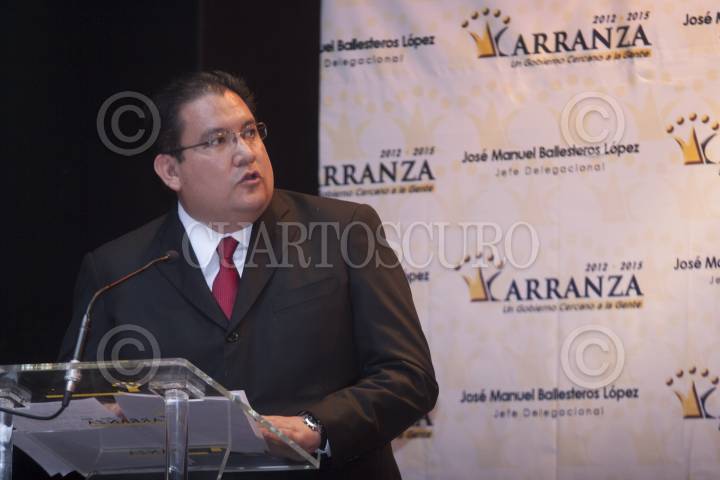 MÉXICO, D.F., 22NOVIEMBRE2012.-El jefe delegacional de Vensutiano Carranza, José Manuel Ballesteros, habló sobre la obra del maestro guatemalteco, José Toledo Ordoñez "Esculturas Peligrosas" que se inauguró hoy en la sala principal, además develaron la escultura, "Angel de la Paz" FOTO: FRANCISCO RODRÍGUEZ /CURTOSCURO.COM