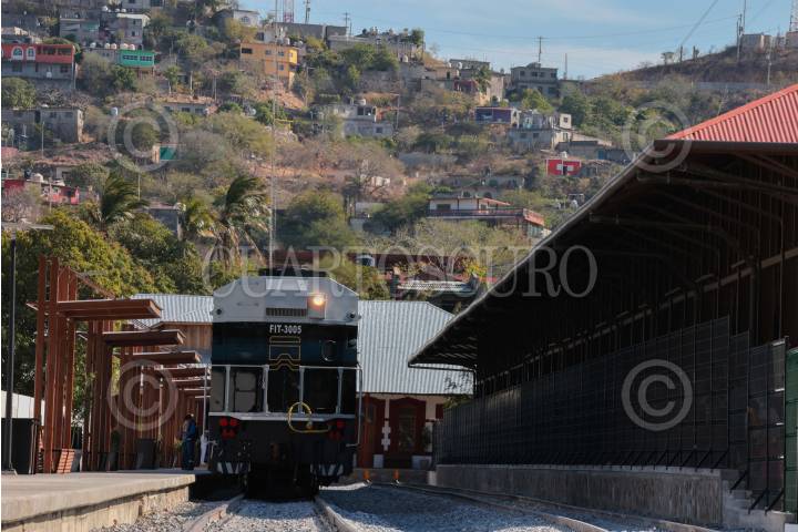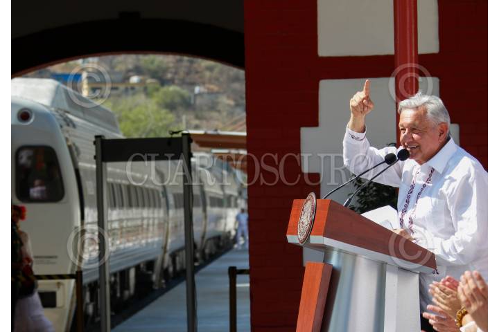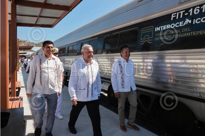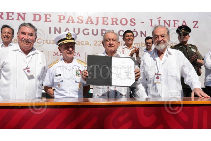 SALINA CRUZ, OAXACA, 22DICIEMBRE2023.- Andrés Manuel López Obrador, presidente de México, encabezó la Inauguración del Tren de Pasajeros del Istmo, Línea Z. En compañía de: Raquel Buenrostro Sánchez, secretaria de Economía; Francisco Andre, Secretario de Estado y Asuntos Exteriores de Portugal; Cuitláhuac García Jiménez, gobernador Constitucional del Estado de Veracruz; José Rafael Ojeda, secretario de Marina; Salomón Jara Cruz, gobernador Constitucional del Estado de Oaxaca; Luis Cresencio Sandoval González, secretario de la Defensa Nacional; Jorge Nuño Lara, secretario de Infraestructura, Comunicaciones y Transportes; Román Meyer Falcón, secretario de Desarrollo Agrario, Territorial y Urbano y Carlos Slim. FOTO: PRESIDENCIA/CUARTOSCURO.COM