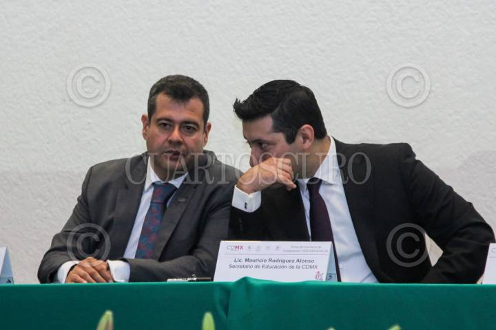 CIUDAD DE MÉXICO, 11AGOSTO2017.- José Ramón Amieva Gálvez, secretario de Desarrollo Social de la Ciudad de México (CDMX), y Mauricio Rodríguez Alonso, secretario de Educación de la capital, durante la firma de convenio entre dicha dependencia y el Consejo de Evaluación del Desarrollo Social de la Ciudad de México, para laborar el libro “La educación motor del desarrollo y movilidad social: El caso del programa Prepa Sí a 10 años de operación”. FOTO: GALO CAÑAS /CUARTOSCURO.COM
