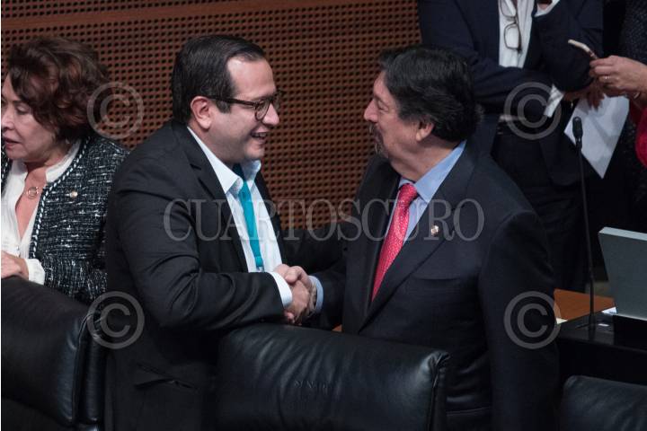 CIUDAD DE MÉXICO, 27NOVIEMBRE2018.- José Ramón López Beltrán, hijo mayor del presidente electo, Andrés Manuel López Obrador, acudió al pleno del Senado de la República en donde saludó a gran parte de los legisladores. En la imagen, saluda a Napoleón Gómez Urrutia, senador por Morena. FOTO: MISAEL VALTIERRA /CUARTOSCURO.COM