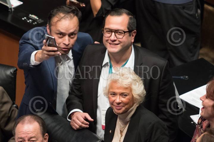 CIUDAD DE MÉXICO, 27NOVIEMBRE2018.- José Ramón López Beltrán, hijo mayor del presidente electo, Andrés Manuel López Obrador, acudió al pleno del Senado de la República en donde saludó a gran parte de los legisladores. En la imagen con Olga Sánchez Cordero, senadora por Morena y quien el día de hoy solicitó licencia indefinida para separarse del cargo y ocupar el de secretaria de Gobernación. FOTO: MISAEL VALTIERRA /CUARTOSCURO.COM