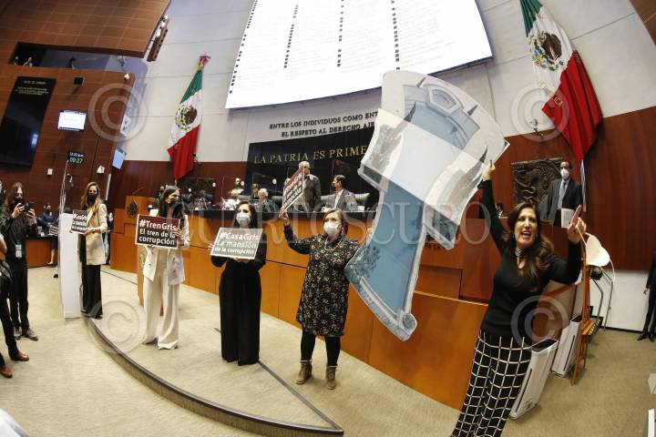 Senadoras panistas colocaron una maqueta denominada Casa Gris, para exigir se esclarezca la relación que tiene José Ramón López Beltrán con la empresa petrolera estadounidense Baker Hughes.