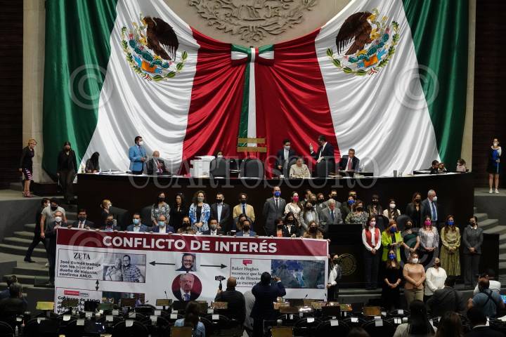 Diputadas y diputados de la bancada panistas subieron a la tribuna de la Cámara de Diputados para extender una manta con la leyenda "Conflicto de Interés" respectiva al caso de la casa en que vivía José Ramón López Beltrán, hijo del presidente Andrés Manuel López Obrador.