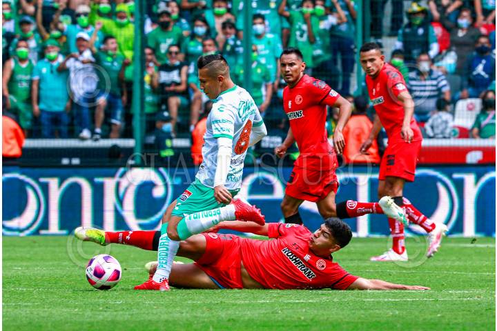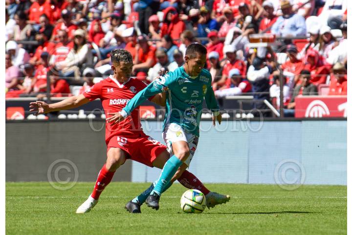Kevin Castañeda medio de los Diablos Rojos del Toluca pelea el esférico a José Rodríguez Medio de la escuadra escarlata de León en el partido de la jornada 16, terminando el encuentro 0-0.
