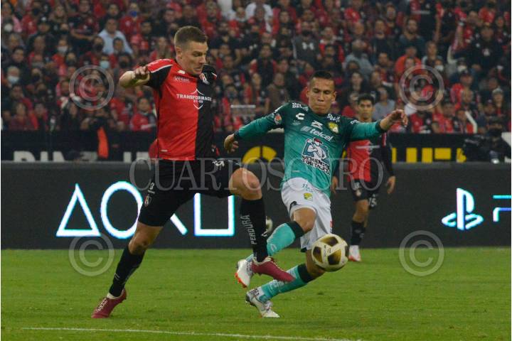 Julio Furch, delantero del Atlas, disputa el balón frente a José Rodríguez, mediocampista del León, en la final de la Liga MX Grita Apertura 2021.