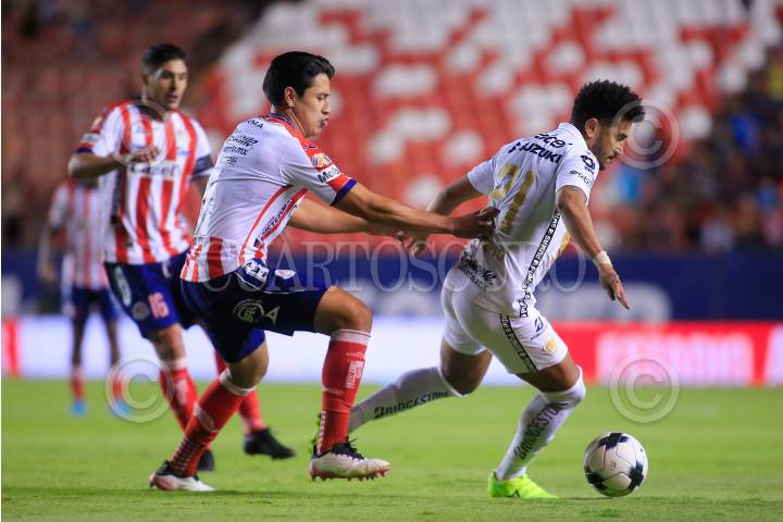 José Rogério de Oliveira Melo (PUMAS) intenta desbordar a un jugador del Atlético de San Luis.