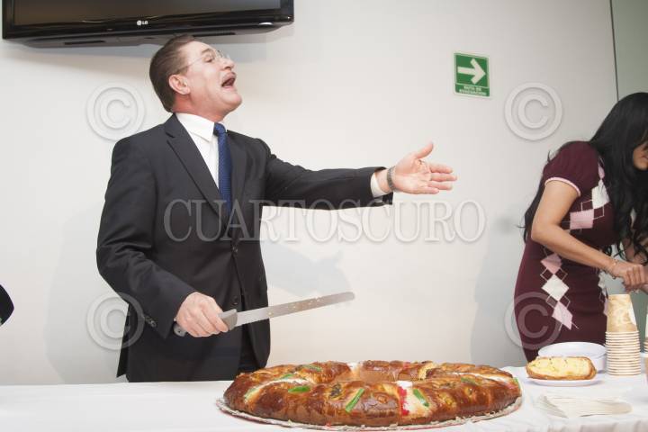 MÉXICO, D.F., 08ENERO2013.- El Senador del PAN, José Rosas Aispuru, momentos antes de cortar la tradicional Rosca de Reyes la cual compartió con los medios de comunicación, al senador Aispuru le tocó el "Muñeco" y prometió los tamales duranguenses. FOTO: FRANCISCO RODRÍGUEZ /CUARTOSCURO.COM