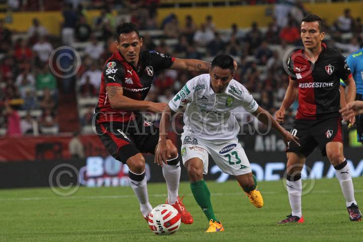 GUADALAJARA, JALISCO. 25ABRIL2015.- El jugador de León José Vázquez, disputa un balón frente al contrario de Atlas Aldo Leao, esto en partido correspondiente a la Jornada 15 del Torneo Clausura 2015 de la Liga MX, en donde se enfrentan los equipos del Atlas frente a León en partido que se celebra en el Estadio Jalisco. FOTO: FERNANDO CARRANZA GARCIA / CUARTOSCURO.COM