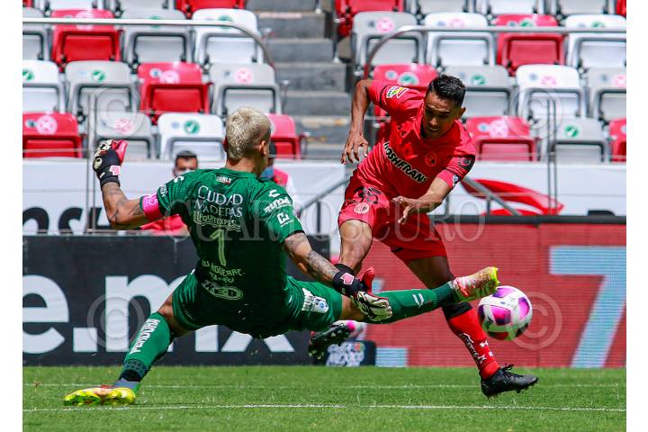 Washington Aguerre portero de la escuadra de Querétaro frente a José Vazquez Medio de los Diablos Rojos del Toluca, durante el encuentro en el estadio Nemesio Diez.