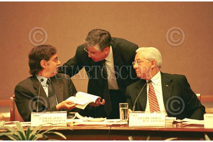 Jose Woldemberg, Jaime Cárdenas y Fernando Zertuche, durante la sesión ordinaria en el IFE donde se discutieron los topes de campaña para los candidatos a diputados, senadores y presidente de la República. FOTO: Pedro Mera/CUARTOSCURO.COM