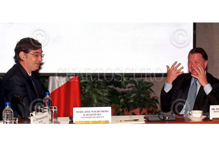 José Woldemberg, presidente del Instituto Federal Electoral (IFE) y Jorge Castañeda, titular de la Secretaría de Relaciones Exteriores (SRE), firmaron hoy un convenio de colaboración que permitirá el intercambio de información sobre la expedición de la matrícula consular. FOTO: Oswaldo Ramírez/CUARTOSCURO.COM