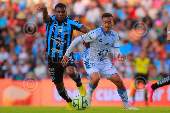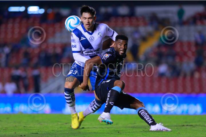 QUERÉTARO, QUERÉTARO, 17SEPTIEMBRE2023.- Sebastián Olmedo del Puebla y Jose Zúniga del Querétaro durante el partido de la jornada 8 del Torneo Apertura 2023 de la Liga MX, en el estadio Corregidora. El marcador fue de 1-1, con goles de Kevin Escamilla (Querétaro) y Diego de Buen (Puebla). FOTO: CÉSAR GÓMEZ/CUARTOSCURO.COM