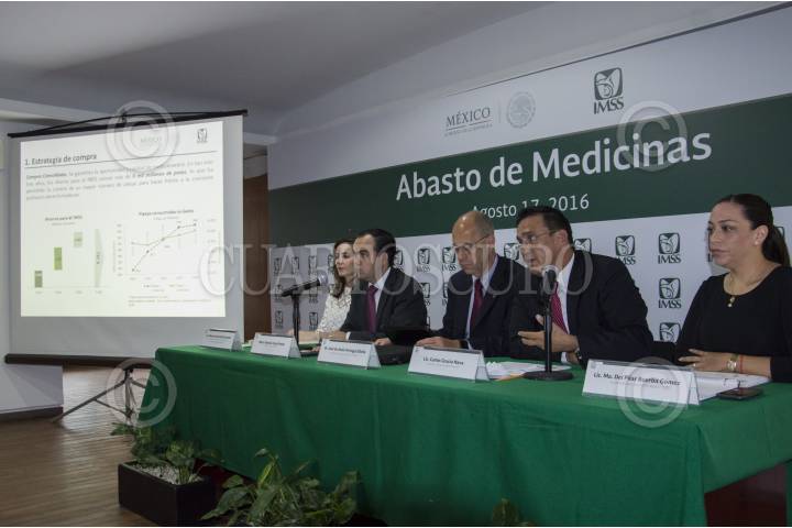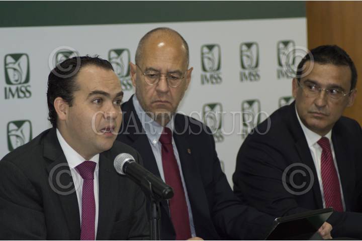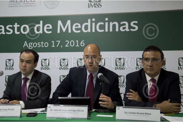 CIUDAD DE MÉXICO, 17AGOSTO2016.- Patricio Caso Prado, director jurídico del Instituto Mexicano del Seguro Social (IMSS); José de Jesús Arriaga Dávila, director de Prestaciones Médicas del IMSS, y Carlos García Nava, titular de la Unidad de Administración, encabezaron la conferencia de prensa en la que se anunció el aumento de 96 a 98 por ciento de abasto de medicamentos en el Instituto durante la presente administración. FOTO: GALO CAÑAS /CUARTOSCURO.COM