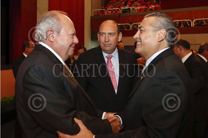 QUERÉTARO, QUERÉTARO, 27JULIO2014.- Carlos Romero Deschamps, líder Petrolero; Rubén Moreira, gobernador de Coahuila; y Manlio Fabio Beltrones, coordinador de la bancada del PRI en San Lázaro; durante el Quinto Informe de gobierno de José Calzada, Gobernador del Estado. FOTO: CUARTOSCURO.COM