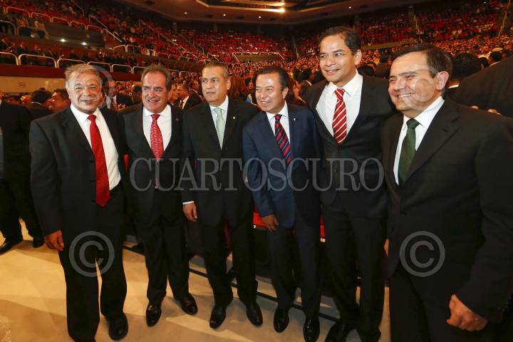 QUERÉTARO, QUERÉTARO, 27JULIO2014.- Alberto Anaya, dirigente del Partido del Trabajo; Carlos Lozano, gobernador de Aguscalientes; Manlio Fabio Beltrones, coordinador de la bancada del PRI en San Lázaro; César Camacho Quiroz, dirigente nacional del PRI; e Idelfonso Guajardo, Secretario de Economía; durante el Quinto Informe de Labores de José Calzada, Gobernador del Estado. FOTO: CUARTOSCURO.COM
