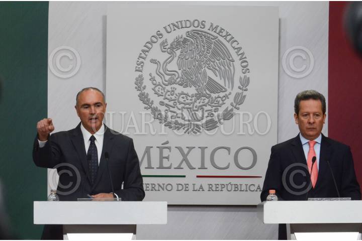 CIUDAD DE MÉXICO, 16MARZO2017.- José Calzada Rovirosa, titular de Sagarpa, y Eduardo Sánchez Hernández, vocero de la Presidencia de la República, aseguraron en conferencia de prensa que las exportaciones de productos agroalimentarios son las más altas de toda la historia y se espera que para este año continúe el crecimiento. FOTO: ANDRÉS YAÑEZ /CUARTOSCURO.COM