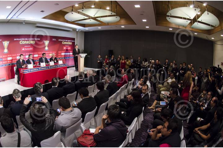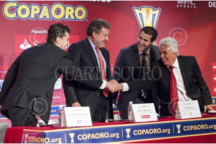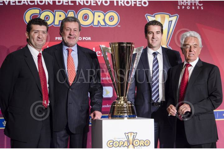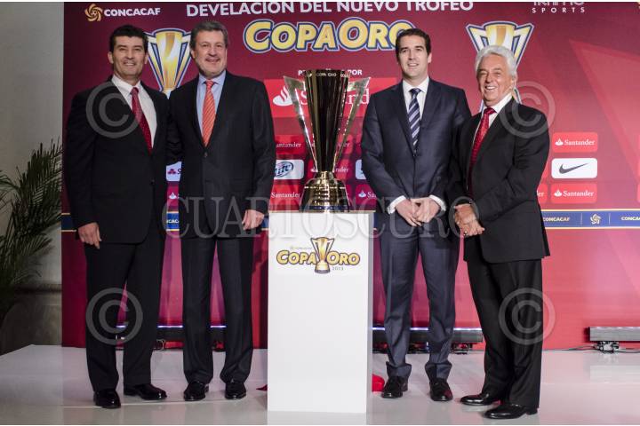 MÉXICO, D.F., 13MAYO2013.- José Manuel de la Torre, Director Técnico de la Selección Mexicana; Marcos Martínez, Presidente Ejecutivo de Santander México; Enrique Sanz, Secretario General de la Confederación de Fútbol de Norte, Centroamérica y el Caribe (Concacaf) y Justino Compeán, presidente de la Federación Mexicana de Fútbol (FMF); presentaron y develaron la nueva Copa Oro que se utilizará el próximo 28 de julio, en el Soldier Field de Chicago. FOTO: MISAEL VALTIERRA / CUARTOSCURO.COM