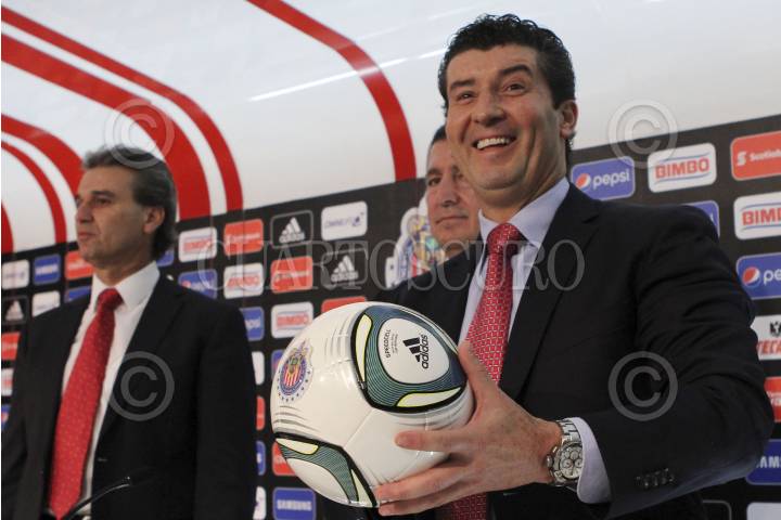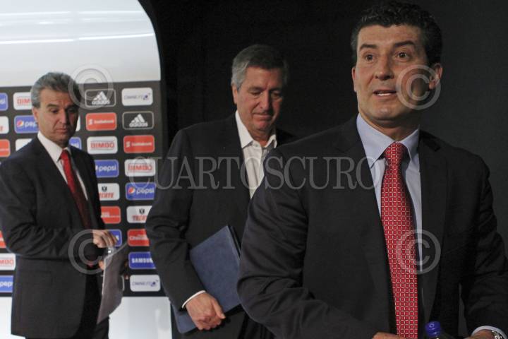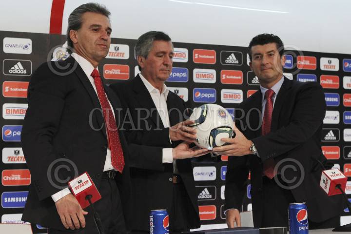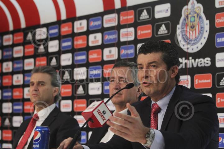 ZAPOPAN, JALISCO, 07OCTUBRE2014.- Esta tarde en la sala de prensa del Estadio Omnilife, Jorge Vergara, dueño del Club Guadalajara y Néstor de la Torre, Presidente Deportivo encabezaron la presentación del nuevo Director Técnico de las Chivas, José Manuel “Chepo” de la Torre. FOTO: FERNANDO CARRANZA GARCIA /CUARTOSCURO.COM