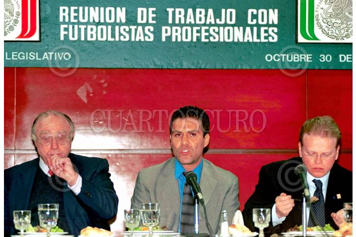 Martín Herrera, José María Huerta, presidente de la Asociación Futbolistas Agremiados de Mexico y Arturo Escobar, sostuvieron una reunión de trabajo en el Recinto de San Lázaro, para analizar el sindicato de futbolistas. FOTO: Christian Palma/CUARTOSCURO.COM