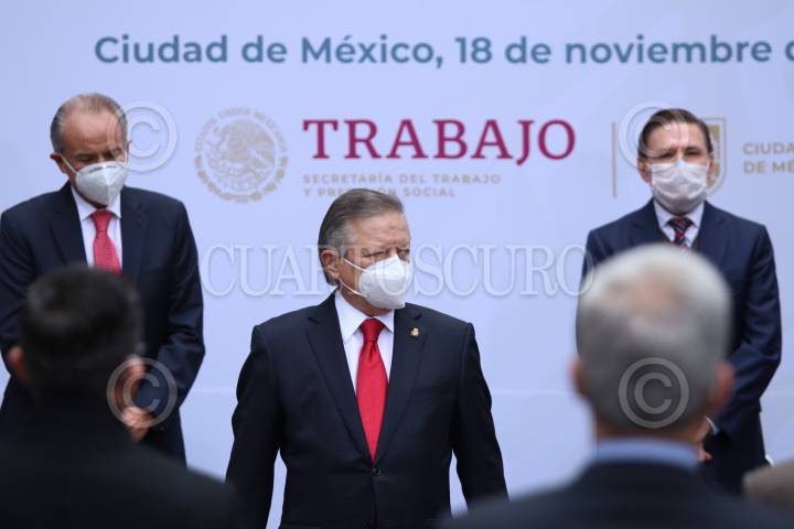 Juan Manuel Carreras, gobernador de San Luis, Arturo Zaldívar Lelo de Larrea, ministro presidente de la Suprema Corte de Justicia de la Nación (SCJN), y José Rosas Aispuro, gobernador de Durango, durante la presentación del Nuevo Modelo Laboral en Palacio Nacional.