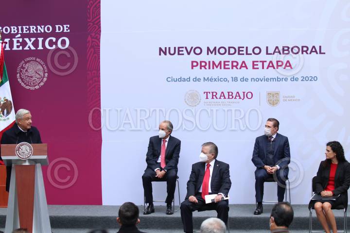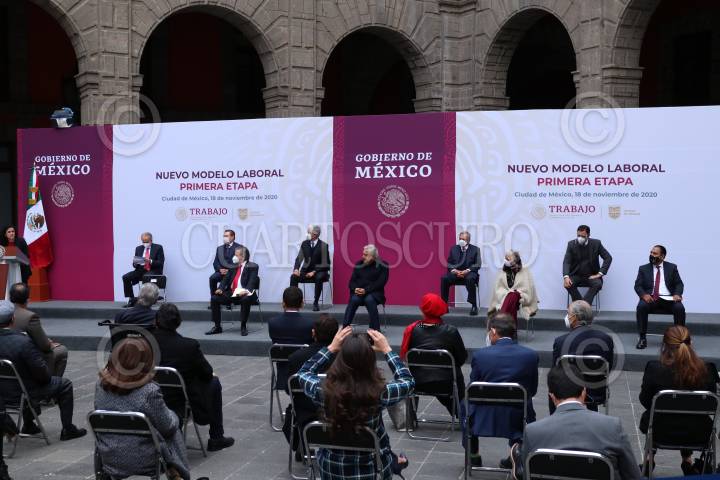 Andrés Manuel López Obrador durante la presentación del Nuevo Modelo Laboral en Palacio Nacional.
