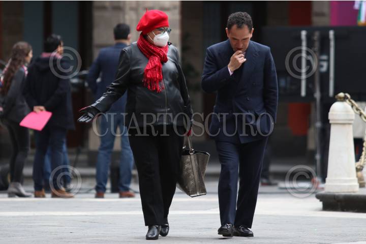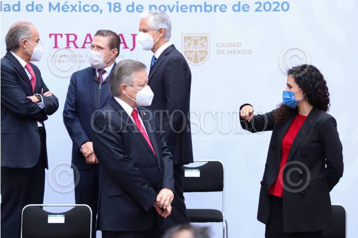 Graciela Márquez, secretaria de Economía, platica con Arturo Herrera, secretario de Hacienda y Crédito Público, al termino de la presentación del Nuevo Modelo Laboral en Palacio Nacional.